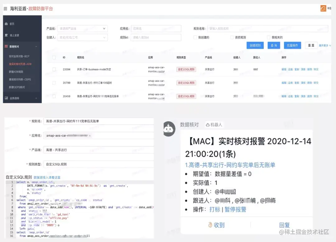 实现数据&资损监控能力:主要监控能力是基于鹰眼的日志实现,应用不报错不代表服务正常,缺少数据和资损的监控。通过数据和核心日志为数据源。集成精卫,tt,adb,bcp,mac的能力,打通了从数据/日志到故障防御平台的实时,准实时,离线核对能力,提供对数据和资损的监控,并统一收口错误结果,定时钉钉提醒。