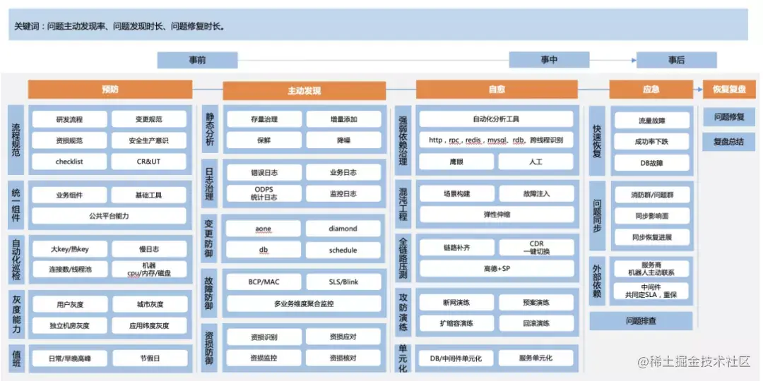 针对以上的稳定性问题,我们整理了从预防、主动发现、自愈、应急等几个方面的一些稳定性建设的解决方案和方向。