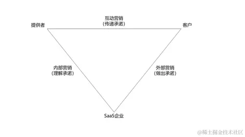 该三角形显示了三个相互联系的群体,他们共同开发、促进和传递服务。三个顶点分别表示三个关键的参与者:SaaS企业,客户,提供者。这里的提供者,可以是内部员工或者渠道伙伴。