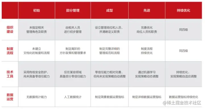 - 组织建设:零信任相关组织的岗位设置、职责划分和人员能力建设;