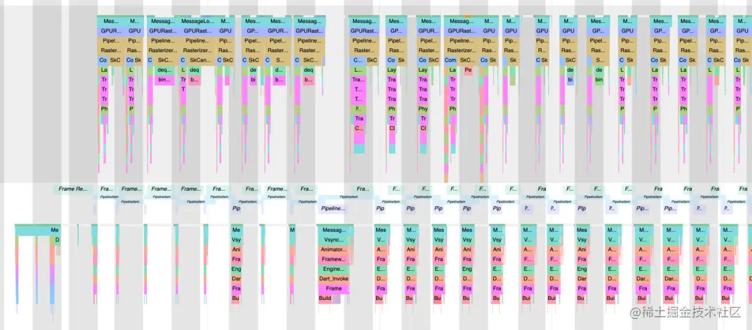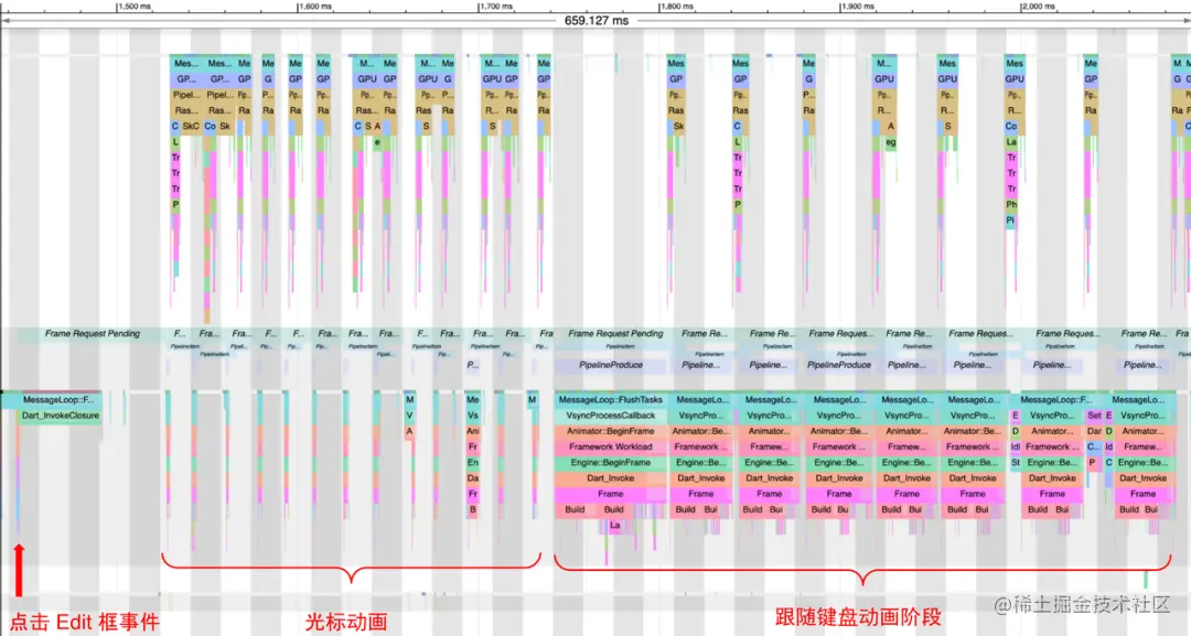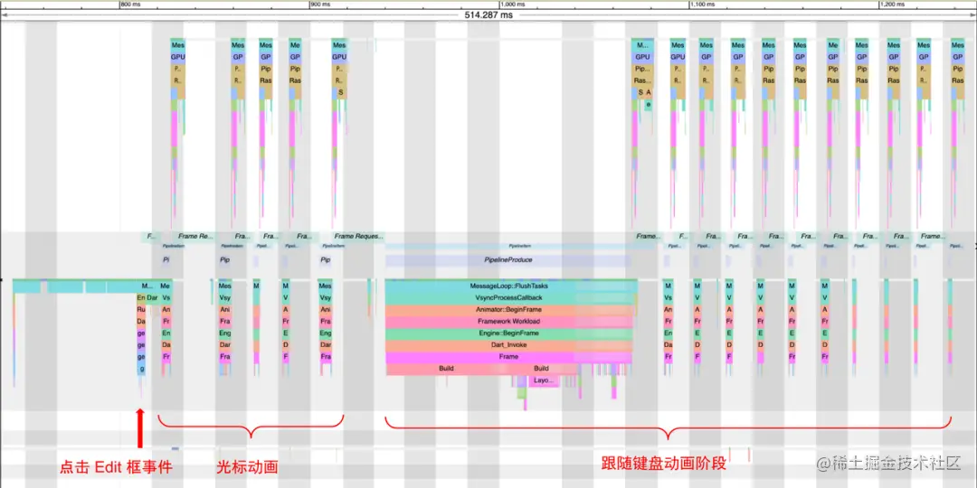 图 3-1-3 正常手机上的键盘卡顿 Systrace 图通过对比图 3-1-2 和 图 3-1-3 我们可以比较直观的察觉到造成该问题的原因了——正常手机仅在动画开始的时候会触发一次页面的 build,而 S10 是每一帧都在重新触发。那么目前的关键是要找出页面被触发 build 操作的原因了。在此之前,我们不妨先看看具体哪些内容被 build 了,这个时候我们就需要借助 Flutter 的 track-widget-creation 功能,我们在 profie 模式下抓取下 timeline:
