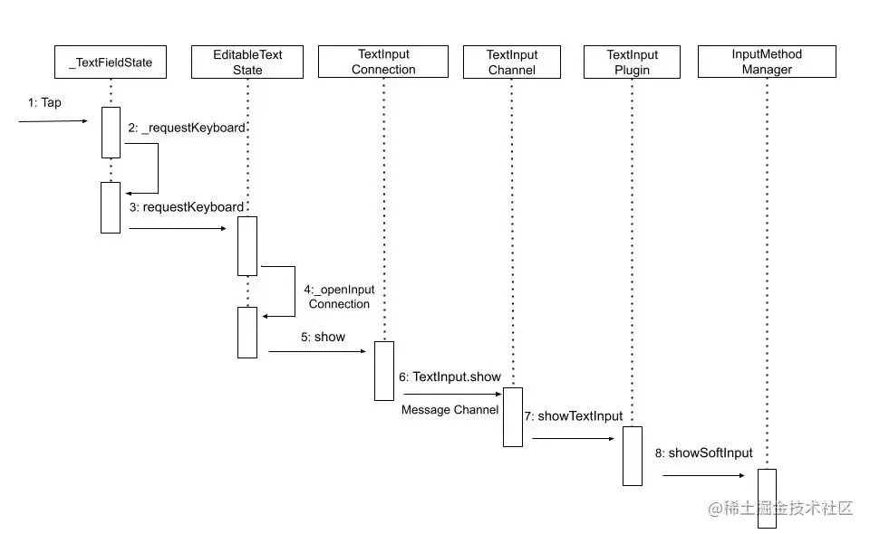 查看 Flutter 源码可以看到键盘弹出流程,以 TextField 为例: