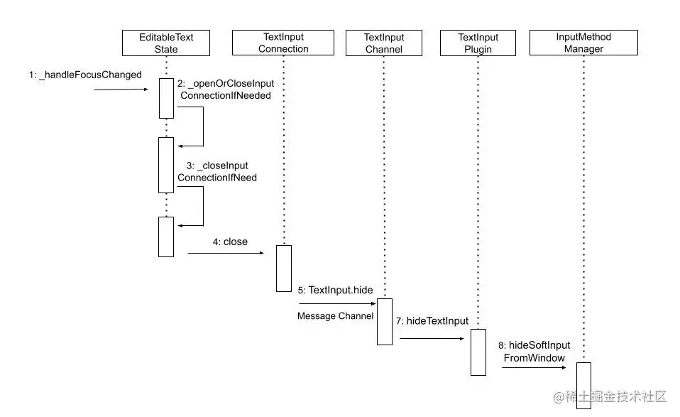 图 3-2-2 Flutter Android 端隐藏键盘流程图那么如何排查这个问题?首先我们观察到了开屏后 EditText 是失去焦点的状态,那么 _handleFoucusChanged 一定是调用了,不管如何我们可以首先在关键节点添加日志。通过日志分析,整体流程是 OK,EditText 失去了焦点、触发了 TextInput.hide 的 MessageChannel 的调用,这个时候我们看下 TextInputChannel 的 onMethodCall 方法: