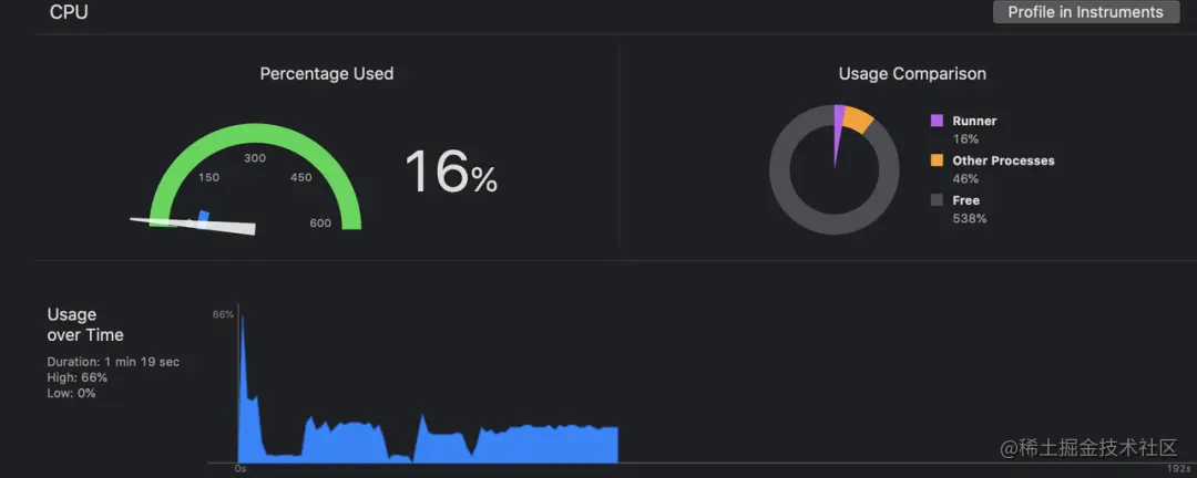 在 iPhone 12 上做了一个简单的测试 ( Profile 模式,性能等切记不要使用 Debug 模式),一旦 EditText 获取到光标之后, CPU 从 4% 上升到了 16%。