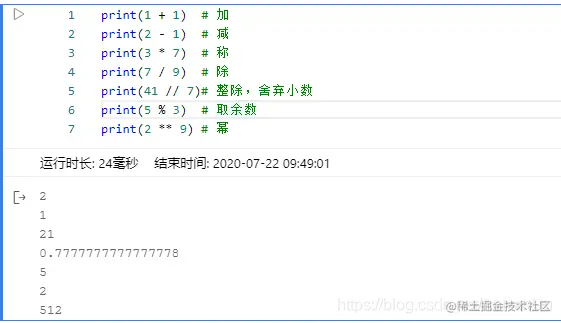 print(1 + 1) # 加 print(2 - 1) # 减 print(3 * 7) # 称 print(7 / 9) # 除 print(41 // 7)# 整除,舍弃小数 print(5 % 3) # 取余数 print(2 ** 9) # 幂 -