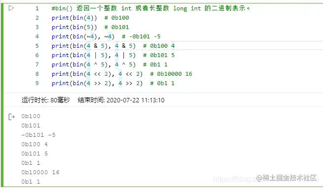 #bin() 返回一个整数 int 或者长整数 long int 的二进制表示。 print(bin(4)) # 0b100 print(bin(5)) # 0b101 print(bin(~4), ~4) # -0b101 -5 print(bin(4 & 5), 4 & 5) # 0b100 4 print(bin(4 | 5), 4 | 5) # 0b101 5 print(bin(4 ^ 5), 4 ^ 5) # 0b1 1 print(bin(4 << 2), 4 << 2) # 0b10000 16 print(bin(4 >> 2), 4 >> 2) # 0b1 1 -
