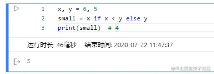 x, y = 4, 5 small = x if x < y else y # 如果x < y则输出前面的x 否则输出 y print(small) # 4 -