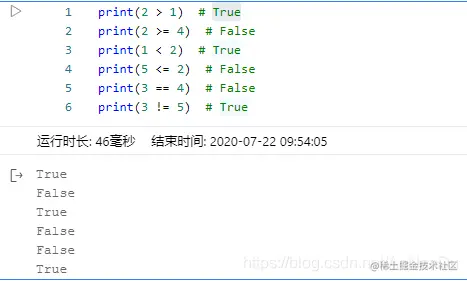 print(2 > 1) # True print(2 >= 4) # False print(1 < 2) # True print(5 <= 2) # False print(3 == 4) # False print(3 != 5) # True -