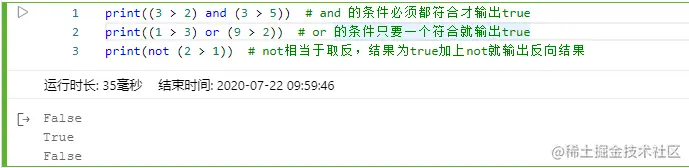 print((3 > 2) and (3 > 5)) # and 的条件必须都符合才输出true print((1 > 3) or (9 > 2)) # or 的条件只要一个符合就输出true print(not (2 > 1)) # not相当于取反,结果为true加上not就输出反向结果 -