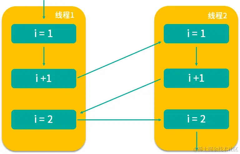 我们根据箭头指向依次看,假设线程 1 首先拿到 i=1 的结果,然后进行 i+1 操作,但此时 i+1 的结果并没有保存下来,线程 1 就被切换走了,于是 CPU 开始执行线程 2,它所做的事情和线程 1 是一样的 i++ 操作,但此时我们想一下,它拿到的 i 是多少?实际上和线程 1 拿到的 i 的结果一样都是 1,为什么呢?因为线程 1 虽然对 i 进行了 +1 操作,但结果没有保存,所以线程 2 看不到修改后的结果。