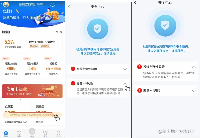其中,华为安全检测服务的几大能力贯穿客户使用App的前、中、后三个阶段,分别检测识别、记录分析多种类型的安全风险,民生直销银行可以根据具体风险检测结果采用针对性的应对措施。例如,系统完整性检测功能在事前进行风险提示,增强终端环境威胁检测能力,防止恶意攻击;虚假用户检测功能使得App在不暴露用户隐私数据的情况下,识别当前交互对象是否为真实的自然人;恶意Wi-Fi检测能够有效识别风险网络环境,实现事中风险分析,从而降低交易风险。App在客户启动环节调用华为安全检测服务,当检测发现应用运行设备存在安全隐患时,应用内会提示客户谨慎使用:“检测到您的设备存在项风险”,在进行风险提示的基础之上,客户可以点击进入安全中心,查看具体检测结果。
