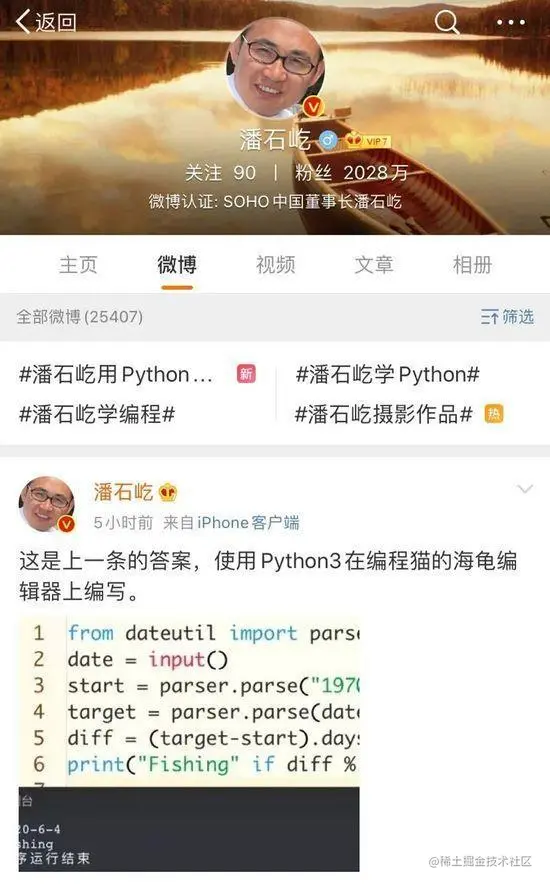 那天开始,潘石屹常在微博提问 Python 相关的问题,有时也会晒一下自己的学习成果。