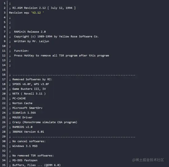 “诗一样优雅的代码”是有市场认证的。雷军在武汉大学计算机系读大三的时候,就通过写程序,赚到100万。毕业之后被金山求伯君当接班人培养,32岁时,他与求伯君合著《深入 DOS 编程》一书出版发行。网上也有一段雷军1994年写的代码,代码太长,简单截图如下: