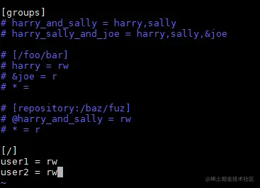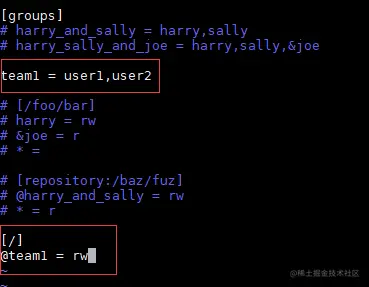 如果用户比较多,可以使用groups形式设置分组team1,并在根目录下指定分组@team1的权限: