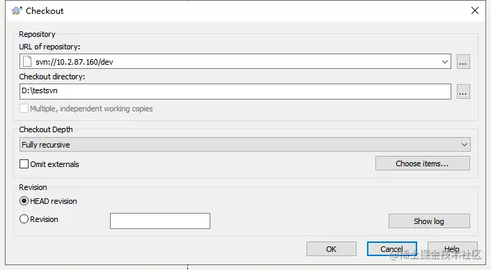 同样TortoiseSVN软件,选择SVN Checkout测试。