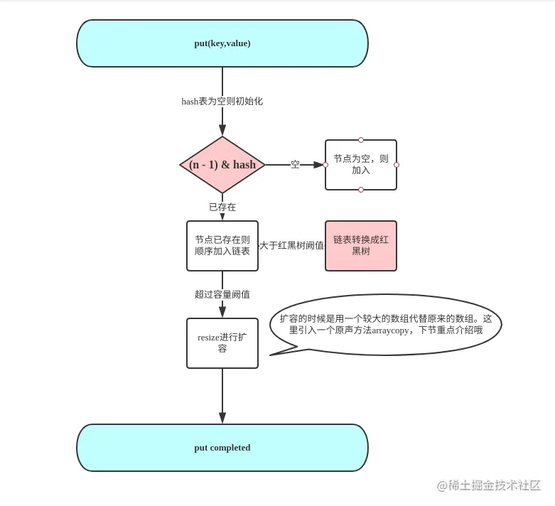 其他方法原理是相同的。值得注意的是remove后临界情况会发生红黑树转链表。所以转红黑树的这个阙值的选取有时候会影响性能的高低。下面看看put的实际源码吧。拜读下大佬的代码。