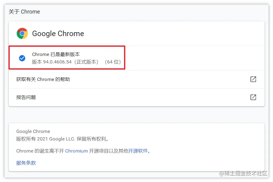 在新标签页输入 chrome://settings/ 进入设置界面,然后选择 【关于 Chrome】