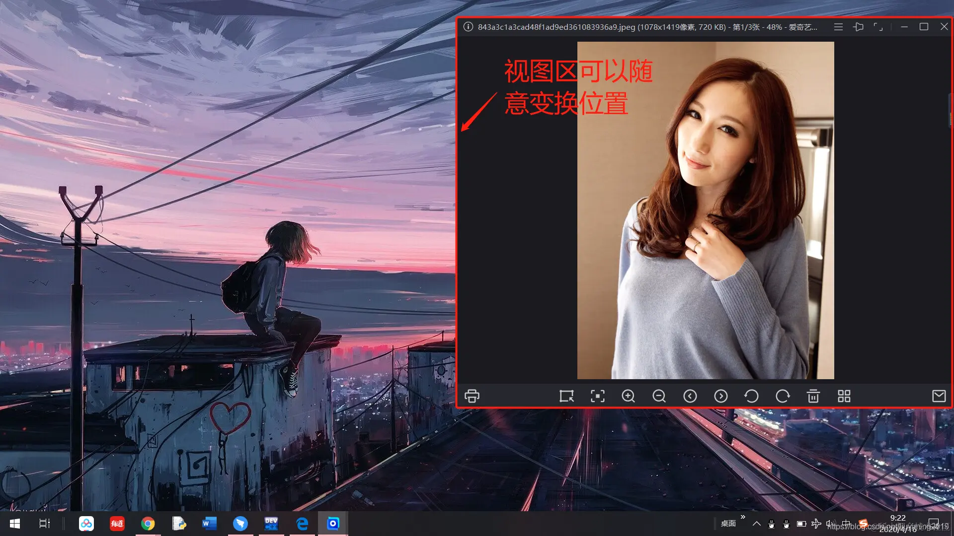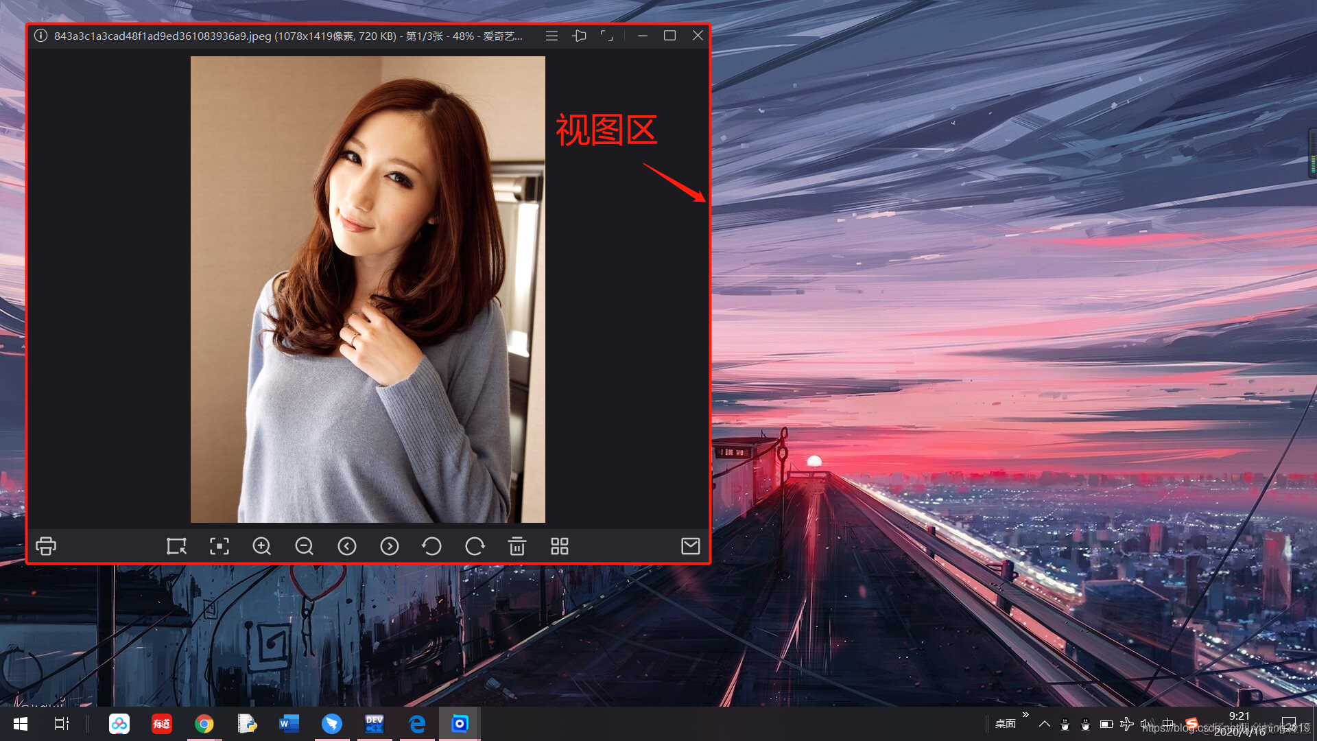 - 视图:将窗口映射到显示设备上的坐标区域称为视图区 (Viewport),视图区可以在屏幕上随意改变位置,如下图中的京香照片。