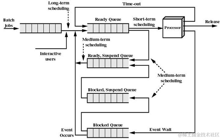 中程调度,从就绪挂起到就绪,从阻塞挂起到阻塞,引入中程调度的主要目的,是为了提高内存利用率和系统吞吐量(这里不谈)