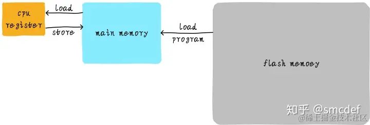 我们应该知道程序是运行在 RAM之中,RAM 就是我们常说的DDR(例如: DDR3、DDR4等)。我们称之为main memory(主存)。当我们需要运行一个进程的时候,首先会从磁盘设备(例如,eMMC、UFS、SSD等)中将可执行程序load到主存中,然后开始执行。在CPU内部存在一堆的通用寄存器(register)。如果CPU需要将一个变量(假设地址是A)加1,一般分为以下3个步骤: