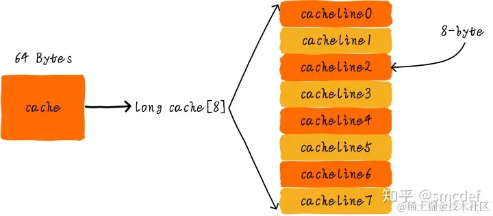 我们假设下面的讲解都是针对64 Bytes大小的cache,并且cache line大小是8字节。我们可以类似把这块cache想想成一个数组,数组总共8个元素,每个元素大小是8字节。就像下图这样。