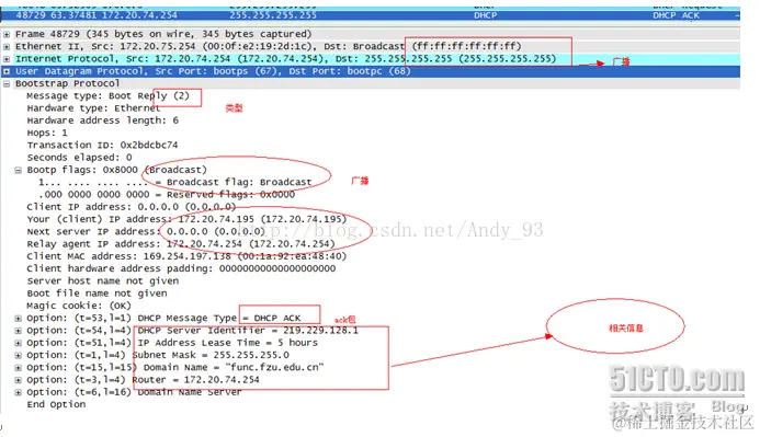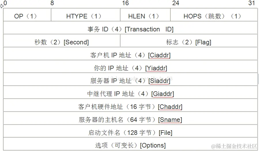 | Ack | Dhcp服务器或者中继器路由的MAC | Dhcp客户机的MAC | Dhcp服务器或者中继路由器的IP地址 | 准备分配的IP地址 |