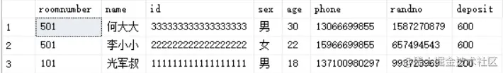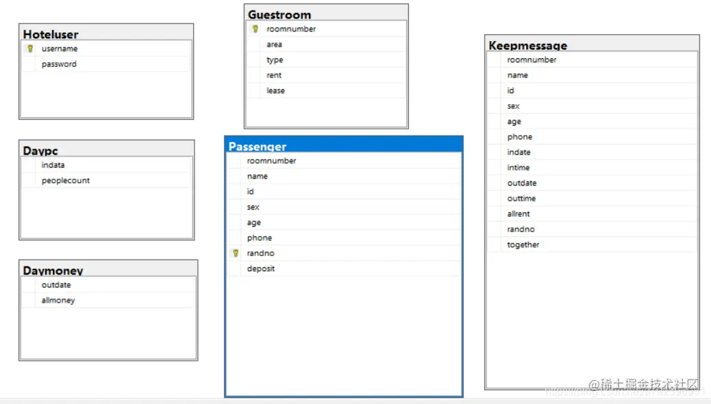 四张表Hoteluser、Guestroom、Passenger、Keepmessage,分别添加测试数据。