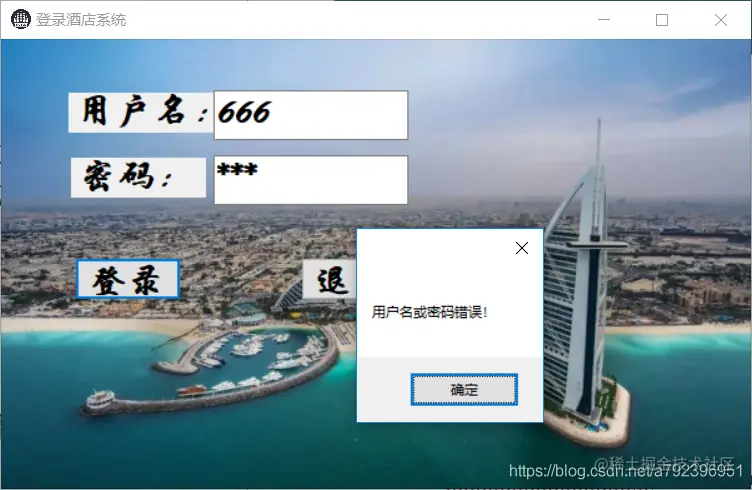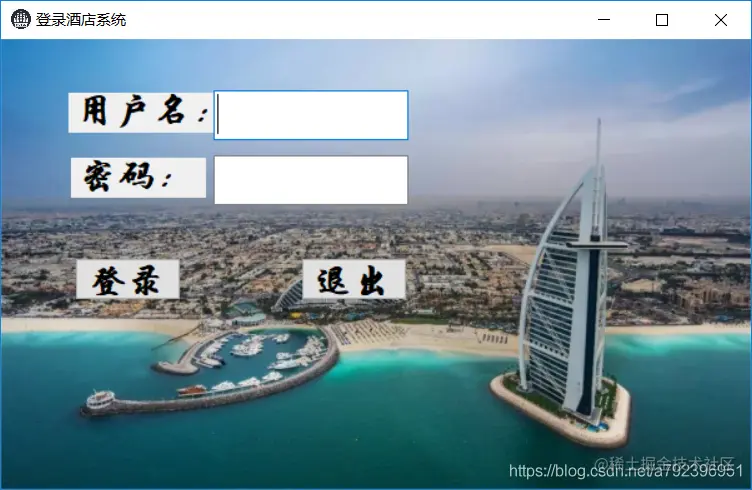 登录页面,连接数据库实现对账号、密码验证"select * from Hoteluser where username='" + username.Text.Trim() + "' and password='" + password.Text.Trim() + "'"