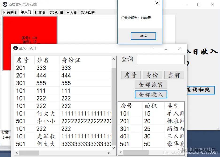 进入查询统计界面,显示所有客房信息、和历史入住信息。并根据不同条件对历史入住信息进行筛选,SQL语句就不一一列举了,还可以统计营业至今总营业额。
