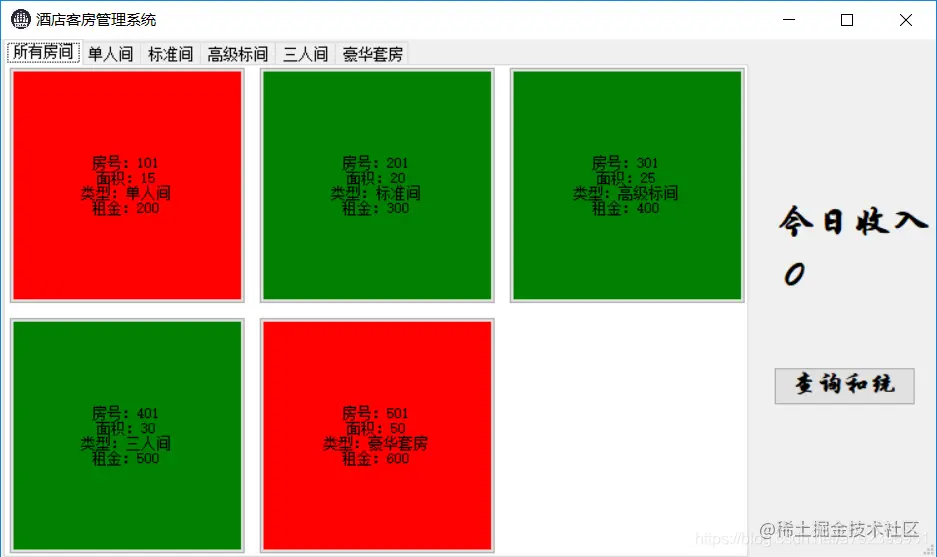 酒店管理系统,"select * from Guestroom"是通过访问数据库获取客房信息动态增加按钮来表示房间,无需修改软件代码,只需要修改数据库就可以实现客房的增删改查。通过每个房间的lease列来判断目前房间是否有人入住,无则用绿色表示,有则用红色表示。用控件TabPage来对房间的类型type进行分类。并统计当天退房的客人的租金来计算今日收入。