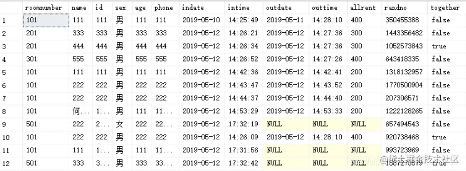 历史订单(订单随机号,房号,姓名,身份证,性别,年龄,手机,入住时间,退房时间,总租金,是否单独一人)