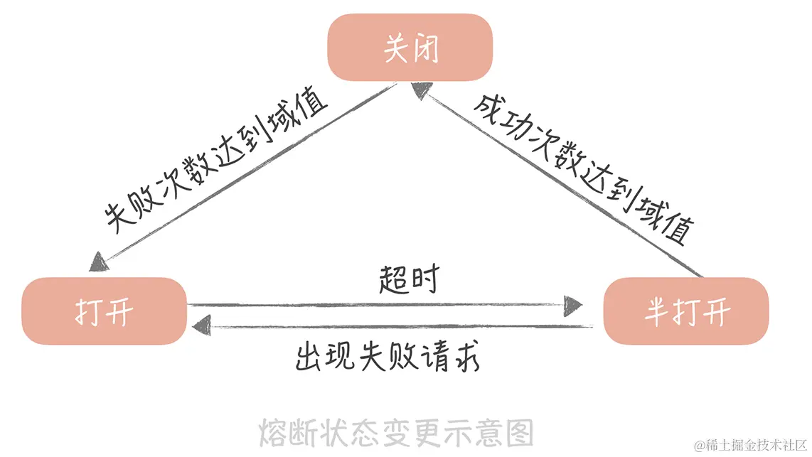 当调用失败的次数累积到一定的阈值时,熔断状态从关闭态切换到打开态