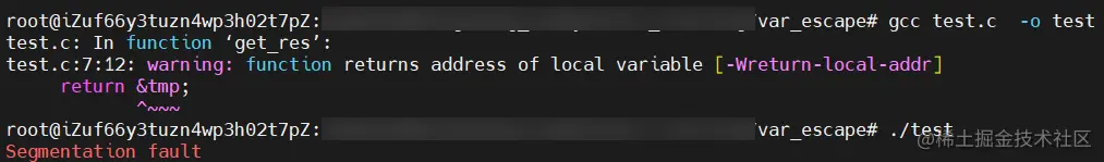 这里可以看出编译程序,报了 warning 了,不过不影响程序的编译 , 这个 warning 报错信息是 因为我们返回了临时变量的地址,C 编译器检测到了,给我们抛出了一个 warning