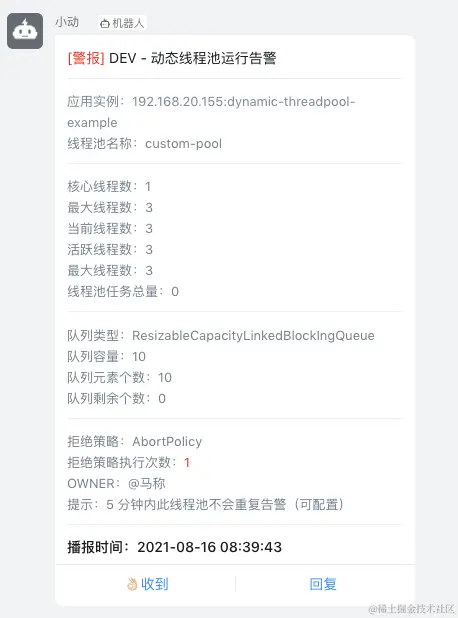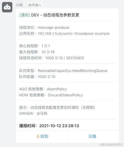 接口调用成功后,观察 dynamic-threadpool-example 控制台日志输出,日志输出包括不限于此信息即为成功