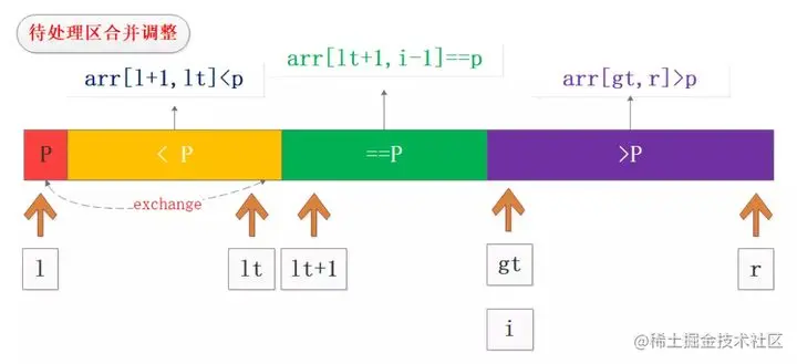 处理完待处理区的全部数据之后的调整也非常重要,主要是将基准值P与lt位置的数据交换,从而实现最终的三分区,如图所示: