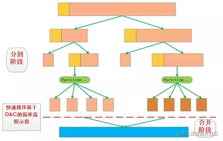 快速排序和归并排序采用的基本思想都是分治思想Divide&Conquer,从D&C思想来看最主要的部分就是分割和合并,两种算法在使用D&C时侧重点有一些差异: