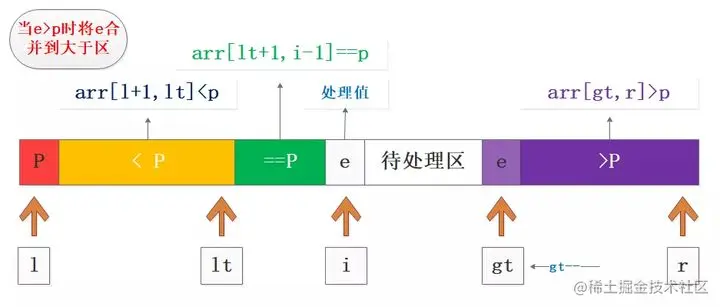 - 处理值e>p,将e与(gt-1)位置的数据交换,扩展大于区gt--,此时i不变,交换后的值是之前待处理区的尾部数据;
