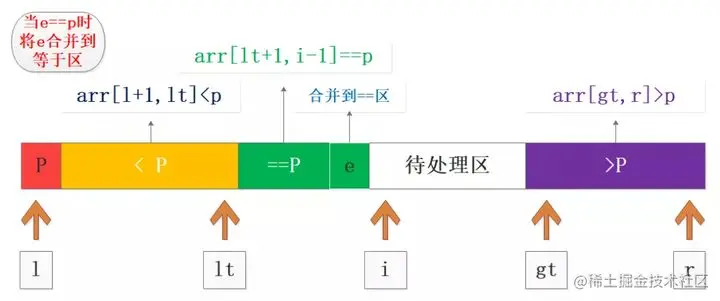 - 处理值e==p,将e合并到等于区,i++;