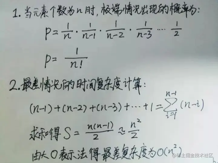 极端情况概率就是每次在剩余所有元素中挑出最小的,这样每次的概率都是1/(n-i),所以组合起来就是1/(n!),所以随机数据集合出现最差情况的概率非常低,但是有序数据下固定基准值选择就可能造成极端情况的出现。