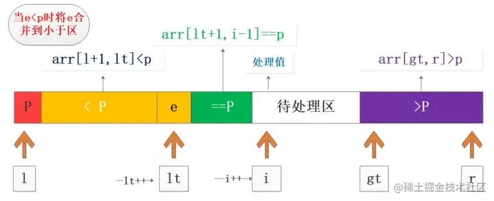 - 处理值e<p,将e与(lt+1)位置的数据交换,扩展小于区lt++,等于区长度不变,相当于整体平移;