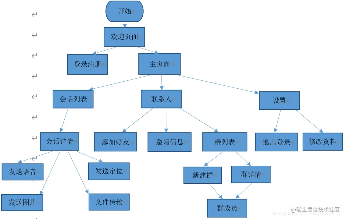 主界面布局由嵌套和组件构成。加载所有群信息;加载所有会话信息、初始化view(FrameLayout/RadioGroup)、初始化数据;会话fragment、联系人fragment、设置fragment、初始化监听rg_main.setOnCheckedChangeListener()判断选中的item是否和上一次选中的item相同,更新当前选中item标记,根据选中的item赋值相应的fragment,切换对应的fragment getSupportFragmentManager()。每次打开主页面默认加载会话页面rg_main.check(mCheckedId);