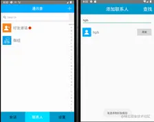 添加好友界面关键代码:获取输入的名称,校验输入的名称不能为空,创建查询的人数据显示和名称显示、监听添加按钮去服务器添加好友EMClient.getInstance().contactManager().addContact(userInfo.getName( ), "添加好友"),全局监听联系人变化。