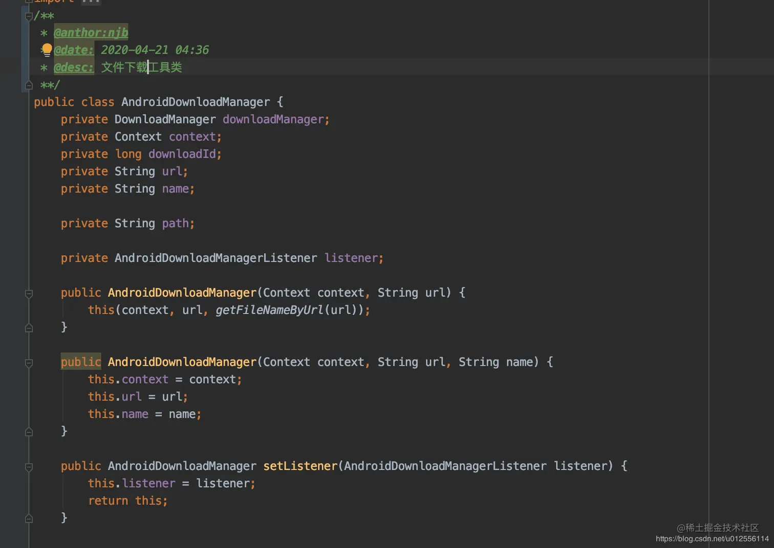 /** * @anthor:njb * @date: 2020-04-21 04:36 * @desc: 文件下载工具类 **/ public class AndroidDownloadManager { private DownloadManager downloadManager; private Context context; private long downloadId; private String url; private String name; private String path; private AndroidDownloadManagerListener listener; public AndroidDownloadManager(Context context, String url) { this(context, url, getFileNameByUrl(url)); } public AndroidDownloadManager(Context context, String url, String name) { this.context = context; this.url = url; this.name = name; } public AndroidDownloadManager setListener(AndroidDownloadManagerListener listener) { this.listener = listener; return this; } /** * 开始下载 */ public void download() { DownloadManager.Request request = new DownloadManager.Request(Uri.parse(url)); //移动网络情况下是否允许漫游 request.setAllowedOverRoaming(false); //在通知栏中显示,默认就是显示的 request.setNotificationVisibility(DownloadManager.Request.VISIBILITY_VISIBLE); request.setTitle(name); request.setDescription("文件正在下载中......"); request.setVisibleInDownloadsUi(true); //设置下载的路径 File file = new File(context.getExternalFilesDir(Environment.DIRECTORY_DOWNLOADS), name); request.setDestinationUri(Uri.fromFile(file)); path = file.getAbsolutePath(); //获取DownloadManager if (downloadManager == null) { downloadManager = (DownloadManager) context.getSystemService(Context.DOWNLOAD_SERVICE); } //将下载请求加入下载队列,加入下载队列后会给该任务返回一个long型的id,通过该id可以取消任务,重启任务、获取下载的文件等等 if (downloadManager != null) { if (listener != null) { listener.onPrepare(); } downloadId = downloadManager.enqueue(request); } //注册广播接收者,监听下载状态 context.registerReceiver(receiver, new IntentFilter(DownloadManager.ACTION_DOWNLOAD_COMPLETE)); } //广播监听下载的各个状态 private BroadcastReceiver receiver = new BroadcastReceiver() { @Override public void onReceive(Context context, Intent intent) { DownloadManager.Query query = new DownloadManager.Query(); //通过下载的id查找 query.setFilterById(downloadId); Cursor cursor = downloadManager.query(query); if (cursor.moveToFirst()) { int status = cursor.getInt(cursor.getColumnIndex(DownloadManager.COLUMN_STATUS)); switch (status) { //下载暂停 case DownloadManager.STATUS_PAUSED: break; //下载延迟 case DownloadManager.STATUS_PENDING: break; //正在下载 case DownloadManager.STATUS_RUNNING: break; //下载完成 case DownloadManager.STATUS_SUCCESSFUL: if (listener != null) { listener.onSuccess(path); } cursor.close(); context.unregisterReceiver(receiver); break; //下载失败 case DownloadManager.STATUS_FAILED: if (listener != null) { listener.onFailed(new Exception("下载失败")); } cursor.close(); context.unregisterReceiver(receiver); break; } } } }; // ——————————————————————私有方法——————————————————————— /** * 通过URL获取文件名 * * @param url * @return */ private static final String getFileNameByUrl(String url) { String filename = url.substring(url.lastIndexOf("/") + 1); filename = filename.substring(0, filename.indexOf("?") == -1 ? filename.length() : filename.indexOf("?")); return filename; } } -