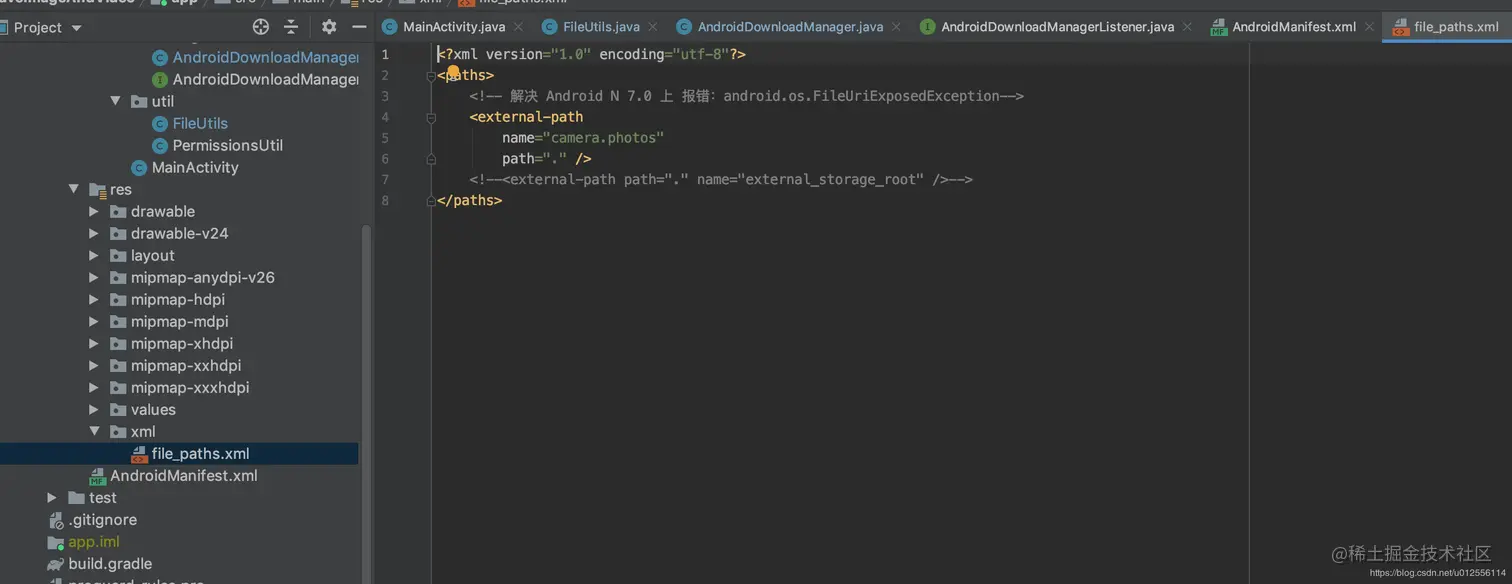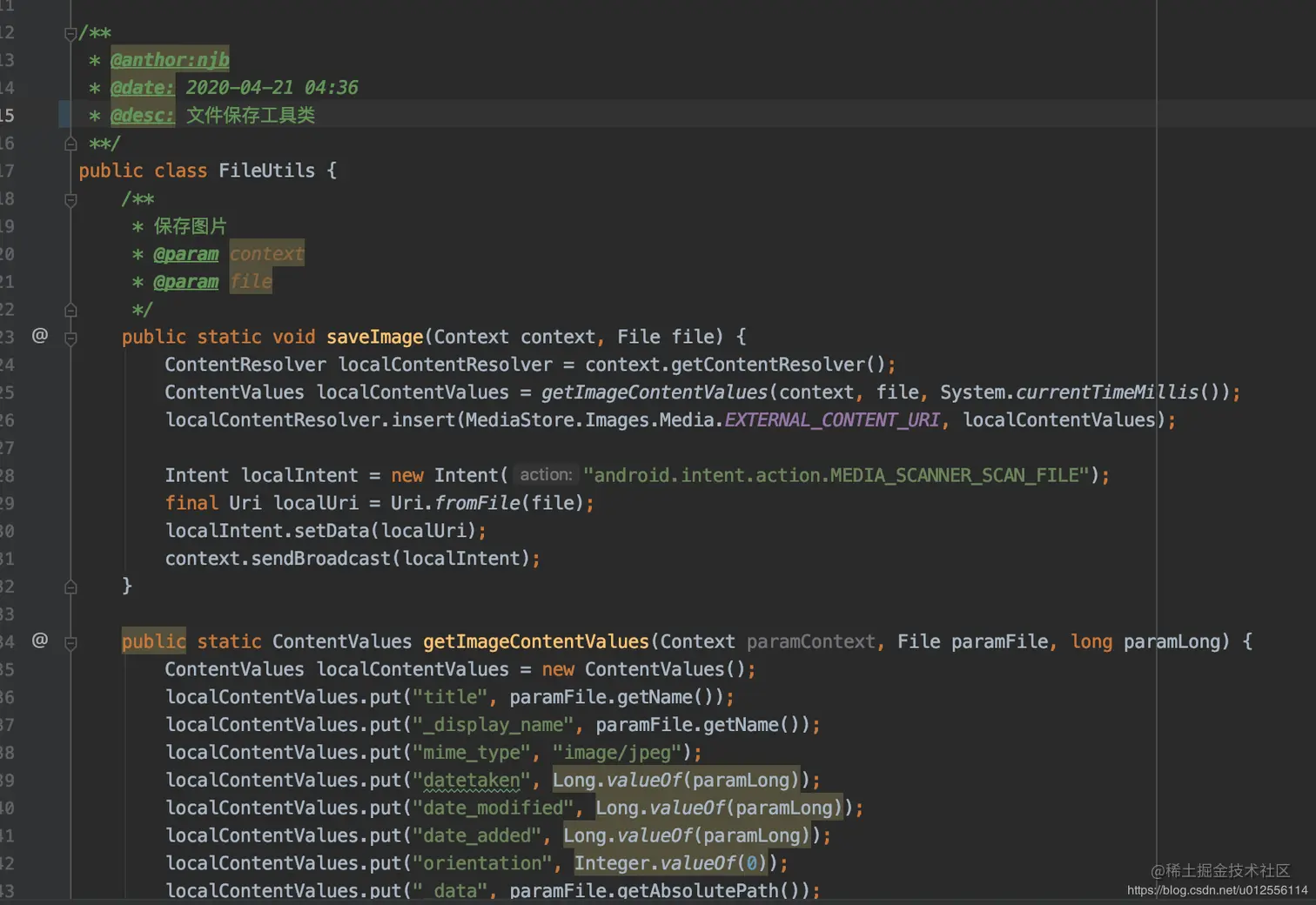 /** * @anthor:njb * @date: 2020-04-21 04:36 * @desc: 文件保存工具类 **/ public class FileUtils { /** * 保存图片 * @param context * @param file */ public static void saveImage(Context context, File file) { ContentResolver localContentResolver = context.getContentResolver(); ContentValues localContentValues = getImageContentValues(context, file, System.currentTimeMillis()); localContentResolver.insert(MediaStore.Images.Media.EXTERNAL_CONTENT_URI, localContentValues); Intent localIntent = new Intent("android.intent.action.MEDIA_SCANNER_SCAN_FILE"); final Uri localUri = Uri.fromFile(file); localIntent.setData(localUri); context.sendBroadcast(localIntent); } public static ContentValues getImageContentValues(Context paramContext, File paramFile, long paramLong) { ContentValues localContentValues = new ContentValues(); localContentValues.put("title", paramFile.getName()); localContentValues.put("_display_name", paramFile.getName()); localContentValues.put("mime_type", "image/jpeg"); localContentValues.put("datetaken", Long.valueOf(paramLong)); localContentValues.put("date_modified", Long.valueOf(paramLong)); localContentValues.put("date_added", Long.valueOf(paramLong)); localContentValues.put("orientation", Integer.valueOf(0)); localContentValues.put("_data", paramFile.getAbsolutePath()); localContentValues.put("_size", Long.valueOf(paramFile.length())); return localContentValues; } /** * 保存视频 * @param context * @param file */ public static void saveVideo(Context context, File file) { //是否添加到相册 ContentResolver localContentResolver = context.getContentResolver(); ContentValues localContentValues = getVideoContentValues(context, file, System.currentTimeMillis()); Uri localUri = localContentResolver.insert(MediaStore.Video.Media.EXTERNAL_CONTENT_URI, localContentValues); context.sendBroadcast(new Intent(Intent.ACTION_MEDIA_SCANNER_SCAN_FILE, localUri)); } public static ContentValues getVideoContentValues(Context paramContext, File paramFile, long paramLong) { ContentValues localContentValues = new ContentValues(); localContentValues.put("title", paramFile.getName()); localContentValues.put("_display_name", paramFile.getName()); localContentValues.put("mime_type", "video/mp4"); localContentValues.put("datetaken", Long.valueOf(paramLong)); localContentValues.put("date_modified", Long.valueOf(paramLong)); localContentValues.put("date_added", Long.valueOf(paramLong)); localContentValues.put("_data", paramFile.getAbsolutePath()); localContentValues.put("_size", Long.valueOf(paramFile.length())); return localContentValues; } }6.文件下载工具类:
