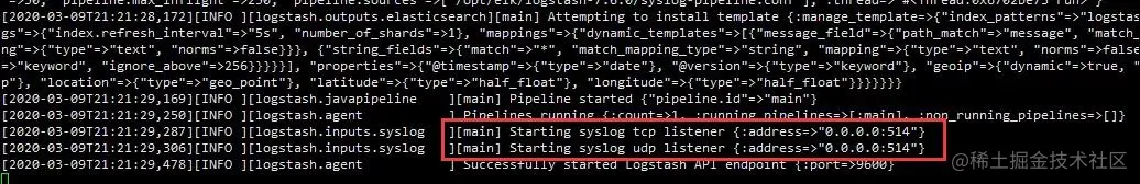 output配置表示输出到elasticsearch,并且同时输出到标准输出也就是控制台。通过执行 bin/logstash -f syslog-pipeline.conf --config.reload.automatic 启动logstash