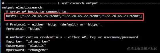输出到es中,在hosts中配置好你的ES服务地址。如果单机只有一个节点,就可以只配一个ip和端口。