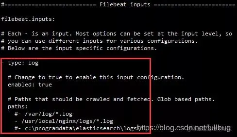 在filebeat的安装目录找到filebeat.yml 配置获取日志文件的路径及输出到ES的配置。