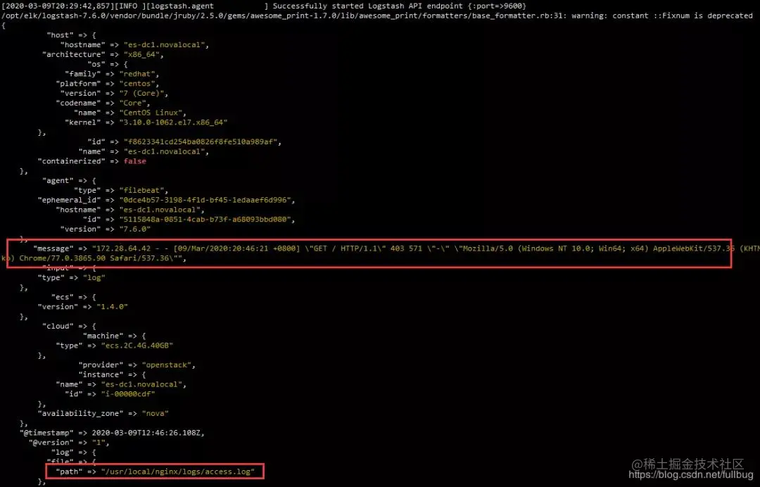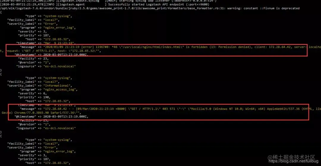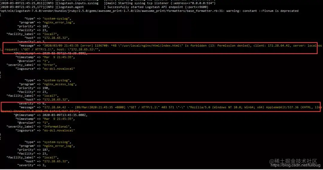 我们访问nginx服务提供的web服务http://172.28.65.32/,在logstash的控制台 可以看到相应的nginx访问access和error的日志