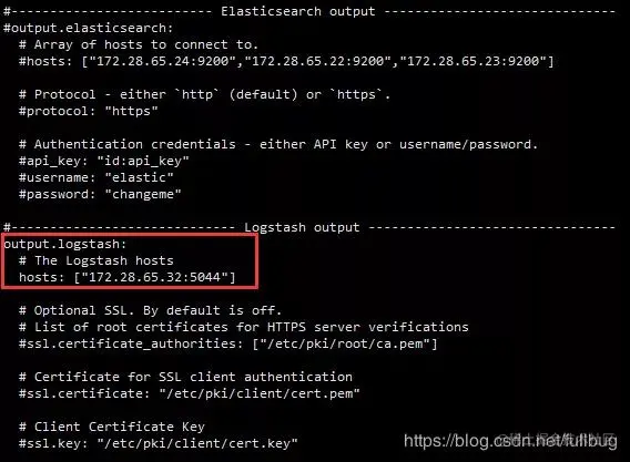 将output.elasticsearch的配置屏蔽,配置output.logstash,配置正确的logstash的服务主机和端口。