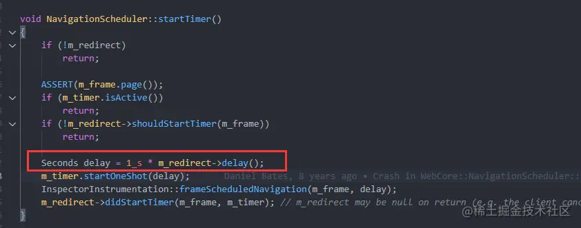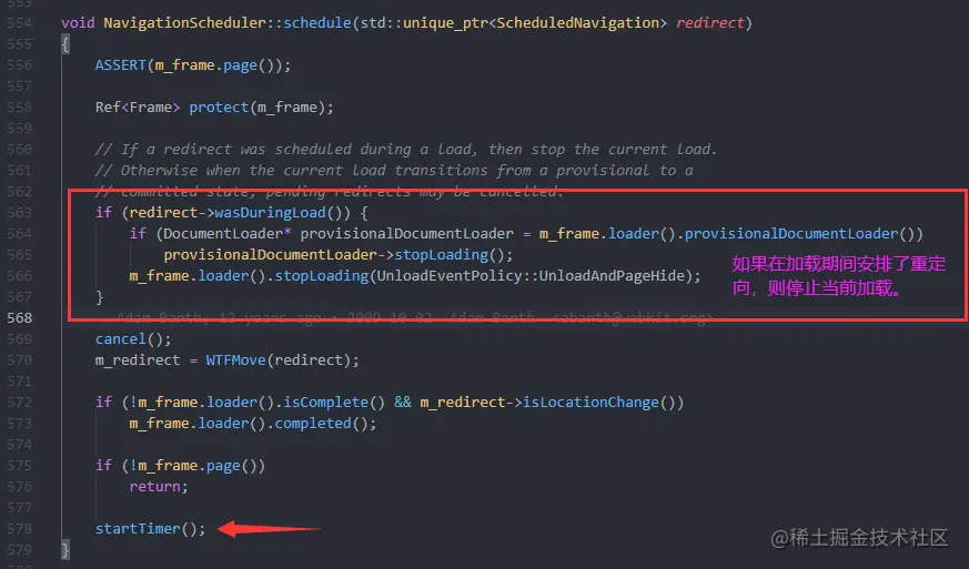 在当前文件搜索schedule,可以查看到方法内部实现,中间判断有个可以多留意的地方,如果页面再加载期间安排了重定向,则停止当前加载。最底部的一个startTimer方法,正式的告诉了我们,探索到现在,你快发现了,居然有定时器!!!